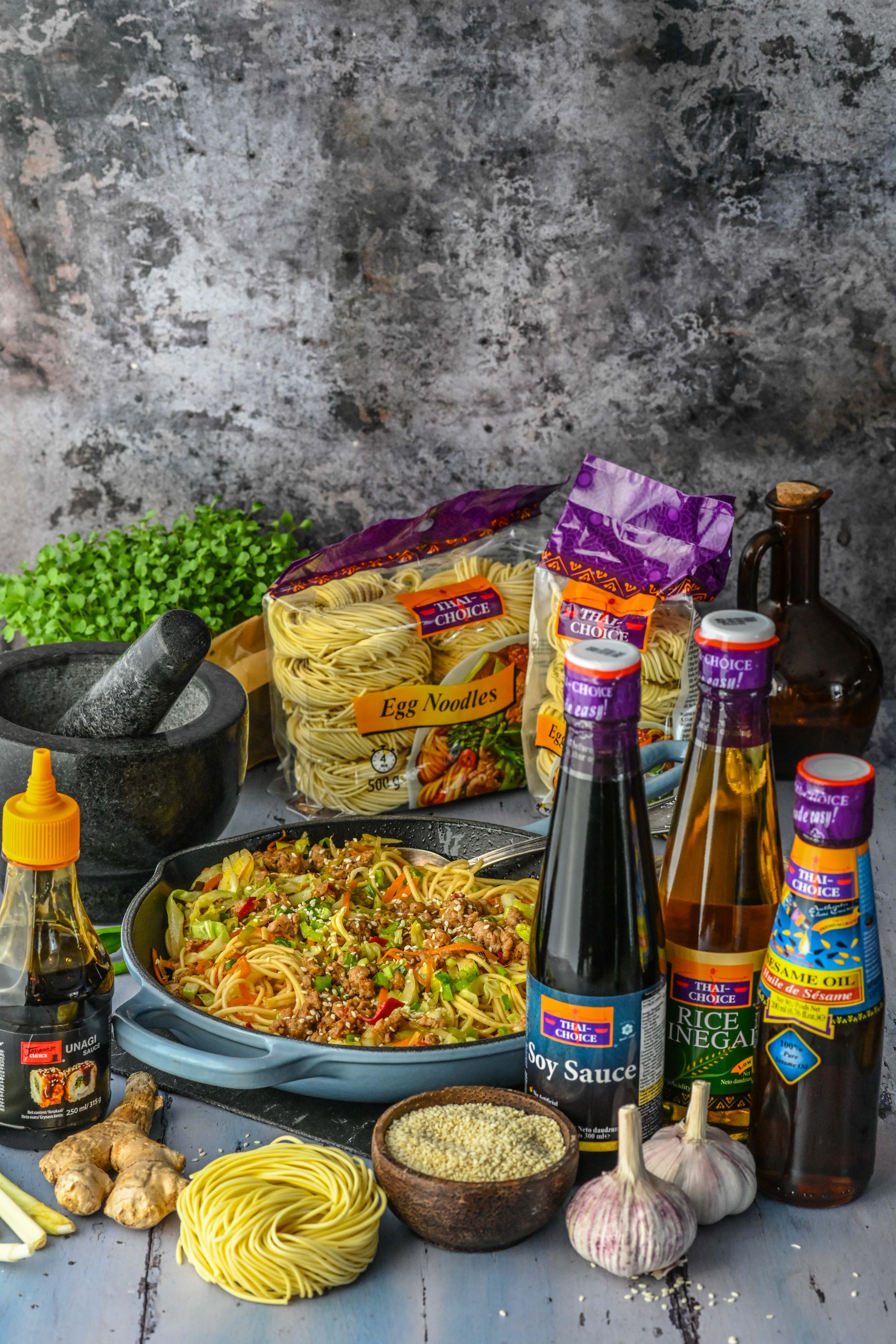 Heat a little oil in a pan and lightly fry the garlic, ginger and chili pepper. Then add the cabbage, onion and carrot strips to the pan and stir-fry them quickly. Add the pre-cooked noodles and fried minced meat to the pan. Pour in the sauce and stir-fry everything together for a few minutes.