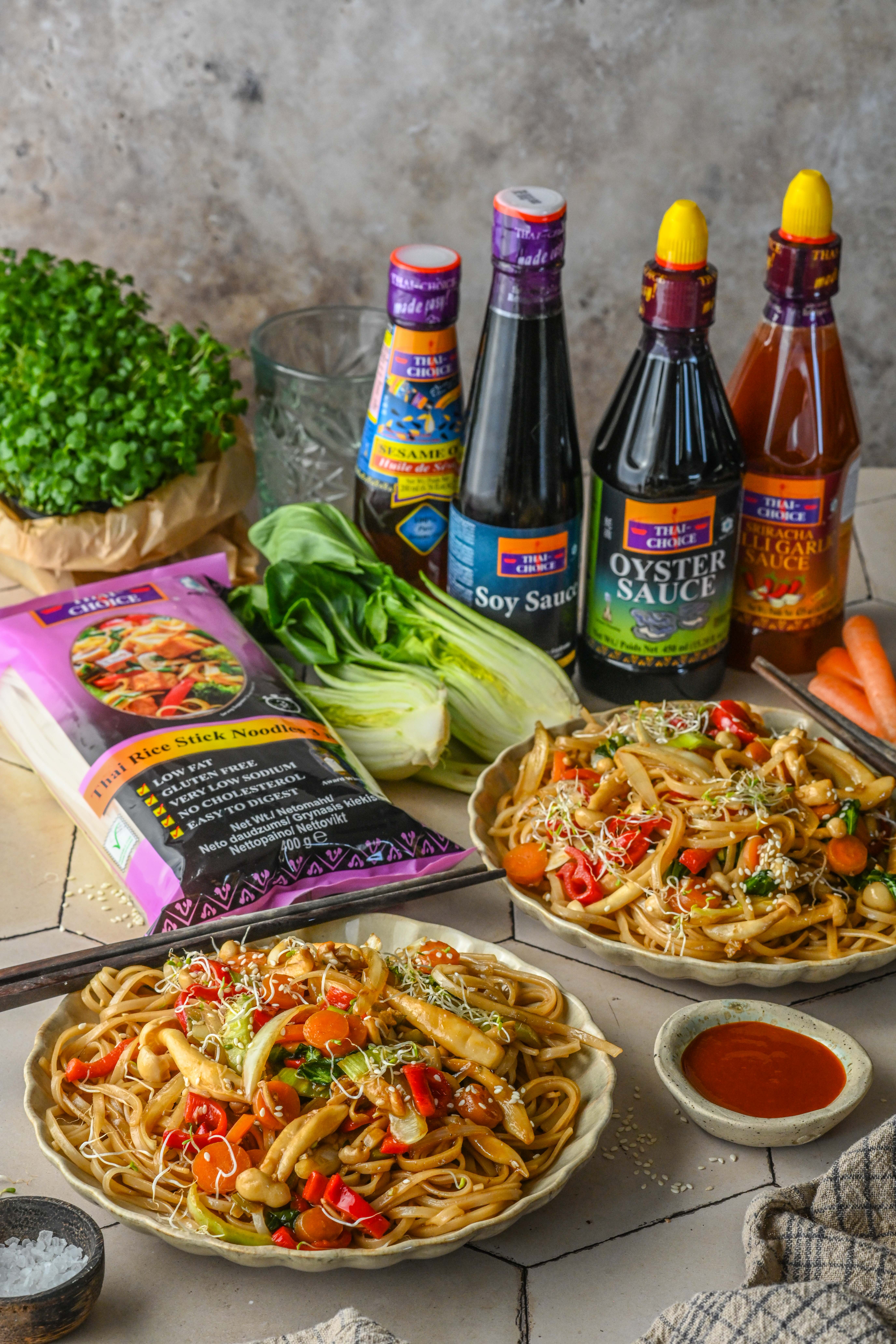 Kalla pannile kaste (sega kaste enne pannile lisamist läbi, et tärklis ei oleks põhja vajunud) ja kuumuta, kuni kaste pakseneb. Lisa nüüd pannile ka riisinuudlid ja sega roog kõik läbi nii, et ka nuudlid oleksid kastmega kaetud. Tõsta taldrikutele ning puista peale seesamiseemneid ning idusid. Serveeri juurde sriracha kastet, et roale veel särtsukust lisada.